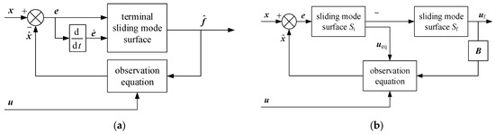 The above disturbance observation methods can effectively estimate and compensate for system disturbances. Among them, the SMO has simple structure and is easy to implement. Other methods have disadvantages such as difficulty with observer parameter adjustment, a poor observation effect on nonlinear disturbances, etc. However, due to the discontinuous switching characteristics, the ordinary sliding mode method has a chattering problem [27]. The terminal sliding mode method introduces nonlinear terms into the sliding mode surface, which can make the observation error converge to zero in finite time, and its dynamic performance is better than the ordinary sliding mode method with state asymptotic convergence under linear sliding mode surface conditions [28]. And the terminal sliding mode method does not have switching items, which can effectively eliminate chattering. However, the introduction of nonlinear terms results in the existence of negative exponential term in the sliding mode control function which will bring about singularity problems [29].