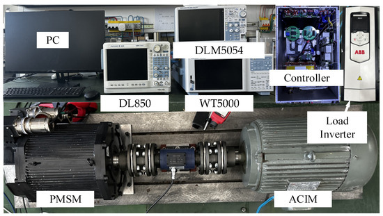 An experimental setup was built to validate the proposed algorithm, as shown in Figure 4. An IPMSM, an asynchronous induction motor (ACIM) and a torque sensor are connected via diaphragm couplings, where the IPMSM is used to test the algorithm proposed in this paper, and the ACIM is used to provide the load torque. The parameters of IPMSM are listed in Table 1.