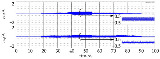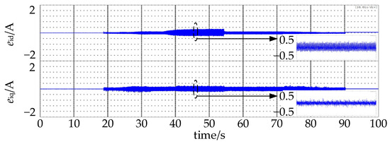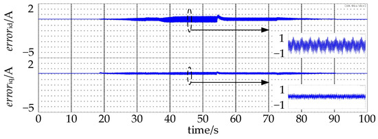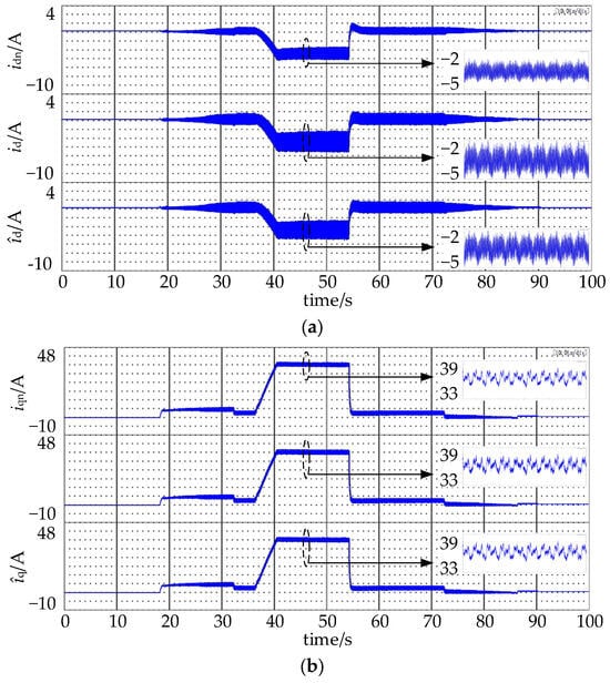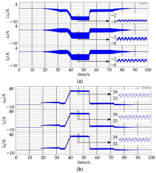 Figure 6 shows the experimental results of currents without disturbance compensation. In Figure 6a,b, the top waveforms in each figure are the currents idn and iqn, calculated by DSP based on the current motor currents id and iq and the voltage given values ud and uq of the current loop through the state Equation (1) under ideal conditions. The middle waveforms in each figure are the actual id and iq obtained by park transformation of the measured phase currents. The waveforms at the bottom of each figure are the current observation values and of the observer. id varies between −1.4 A and −5.7 A, and iq varies between 34.2 A and 38.2 A when speed is 1400 rpm and torque is 20 N·m.