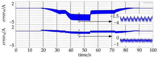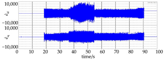 Figure 8 shows the difference between the observed currents and the actual currents, that is, the current observation error e in (9). Although the fluctuation range of observation error increases with the increase in speed and load, it still remains within a small range. Both eid and eiq fluctuate between −0.2 and 0.2.