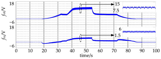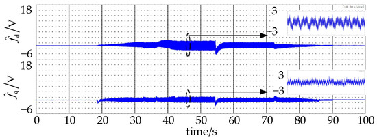 The observed lumped disturbance value with the disturbance compensation is shown in Figure 14. At this time, is no longer the observed values of f, but f − fc in (7), that is, the remaining disturbances after compensation. The steady-state of also become close to zero. varies between −2.2 V and 2.1 V, and varies between −1.2 V and 1.2 V when speed is 1400 rpm and torque is 20 N·m.