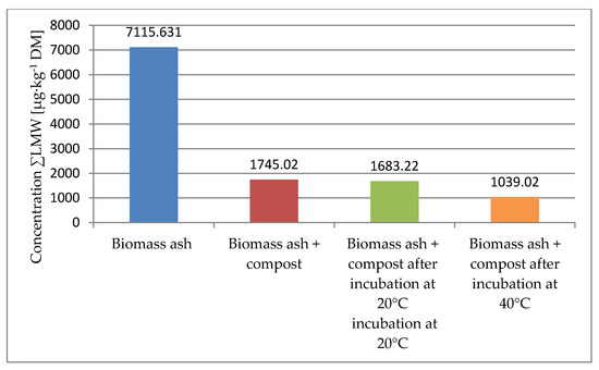 The content of the light fraction of PAHs (abbreviated as LMW, i.e., the group of PAH congeners made up of a smaller number of rings (2–4)) in the ash studied was 7115.631 µg∙kg−1 [Figure 2]. In a study by Szatyłowicz and Skoczko, the ΣLMW content in ash from wood and pellet combustion was 18010 µg∙kg−1 and 4090 µg∙kg−1, respectively [51]. Co-composting the ash resulted in a decrease in ΣLMW from 1745.02 µg∙kg−1 to 1683.22 µg∙kg−1 when composted at 20 °C and to 1039.02 µg∙kg−1 when incubated at 40 °C.