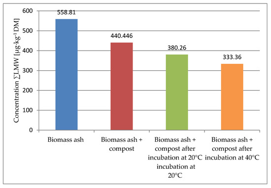 The content of the heavy fraction of PAHs abbreviated as HMW consisting of hydrocarbons containing five or more aromatic rings in the tested ash was 558.81 µg∙kg−1 [Figure 3]. In contrast, the results obtained by Košnář et al. showed the content of ΣHMW in ash-fertilised soil to be 508 µg∙kg−1 [52]. The composting process at 20 °C reduced ΣHMW from 440.446 µg∙kg−1 to 380.26 µg∙kg−1, while increasing the incubation temperature resulted in a greater decrease in HMW to 333.36. µg∙kg−1.