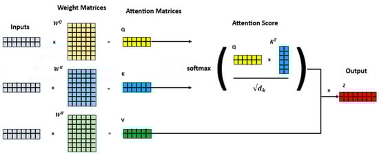 The self-attention mechanism is a key component of Transformer-based approaches, which have revolutionized many application fields. The concept of self-attention allows the model to determine dependency relations between positions within a sequence of inputs. For each encoder input vector, three vectors are associated: the query vector (), key vector (), and value vector (). To speed up the calculation process, the three vectors are plotted in a matric form, where each row corresponds to one input vector. In Figure 3, the expedited calculation process is visually represented through the use of matrix forms for the three previously described vectors. Each row within these matrices corresponds to an individual input vector. Going forward, symbolizes the query matrix, represents the key matrix and stands for the value matrix. In the following, these matrices are multiplied by the corresponding weight matrices ( for each matrix, which are adjusted during the training process and are initially randomly initialized. After the computation of the three matrices, the attention mechanism computes a score between the query matrix ( and the key matrix (, as the dot product divided by the square root of their dimensionality. After this, the scores are normalized by applying the softmax function. Finally, the output is calculated by multiplying the softmax score with the value matrix (. In Figure 4, this process is once again vividly illustrated through the use of blocks. This breakdown into individual blocks illustrates the overall flow. The resulting scores determine the degree of attention placed on other parts of the input sequence when processing a specific element of the token at a given position. In this process, important values are highlighted, and less relevant values become small [26].