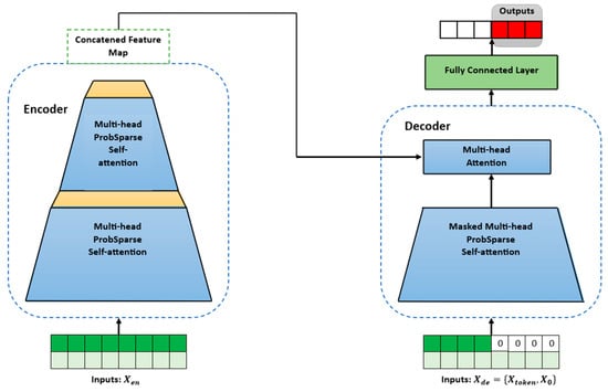 The Informer architecture is specifically designed for long-term forecasting. As illustrated in Figure 5, the Informer model is composed of an encoder and a decoder. Informer uses a probabilistic (prob) sparse self-attention mechanism instead of a canonical self-attention mechanism. This change reduces the time complexity and memory usage per layer, which is significant for solving long-term forecasting [15]. This reduction in time complexity and memory usage is achieved by using a subset of queries to calculate the score in the prob sparse self-attention. The most relevant subset is determined by a probability measurement, the Kullback–Leibler (KL) divergence. The KL divergence is a statistical metric that measures the dissimilarity between a given probability and a reference probability distribution. In the prob sparse self-attention mechanism, the KL divergence is used to quantify how diverse or focused the attention probabilities are for a given query. In other words, the KL divergence is the basis of the sparsity measurement. It selects the likely most informative queries based on their attention probability distributions. A more diverse distribution means that the query is more informative, while a focused distribution implies that the query is less informative and can therefore be discarded for further calculations. This approach allows the Informer model to selectively attend to queries based on the diversity of their attention distributions, and more likely informative queries are used for calculating the output of the self-attention layer.