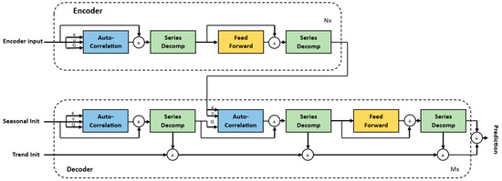 As illustrated in Figure 7, the Autoformer model adopts a different approach than the previous Transformer models, based on decomposition and autocorrelation. The decomposition of time series is a technique used to disassemble time series data into their component parts. The primary components that the decomposition block of the Autoformer model disassembles from the time series data are trend and seasonality. The goal is to discern underlying patterns within the data, such as considering seasonality in the context of predicting energy from PV sources to resolve hourly, daily, monthly or yearly patterns, or considering long-term patterns (trend component) to determine whether the time series or certain periods exhibit an increase or a decrease or remain relatively stable over time. Series decomposition is performed as an inner block of the encoder and decoder, where the input series are split into the seasonal part and the trend-cyclical part. First, the encoder focuses on the extraction of seasonal components by eliminating the trend component. The extraction of the trend cycle is achieved by applying a moving average with padding to the input data, in order to smooth out periodic fluctuations. Consequently, the seasonal part is attained by subtracting the extracted trend cycle part. Then, the resulting periodicity is utilized by the auto-correlation mechanism to group similar periods from other sub-time series. Finally, this seasonal information is passed, as cross-information, to the decoder so that it can further refine the prediction. In comparison to the two other Transformer models, the Autoformer model replaces the self-attention mechanism with auto-correlation. The decoder consists of an upper branch and a lower branch, which comprise the accumulation part of trend-cyclical parameters and a stacked structure for seasonal components. The upper branch is a stacked structure to capture seasonal components, which initially employs auto-correlation to capture the inherent temporal dependencies present in the predicted future states. Subsequently, it leverages historical seasonal information from the encoder to decipher specific dependencies and refine the forecast. The auto-correlation block identifies dependencies by calculating the series autocorrelation and aggregates similar subseries through time-delay aggregation [16]. Subseries that share a common periodicity are considered similar, and time-delay aggregation is a technique used to combine multiple of such subseries into a unified representation.
