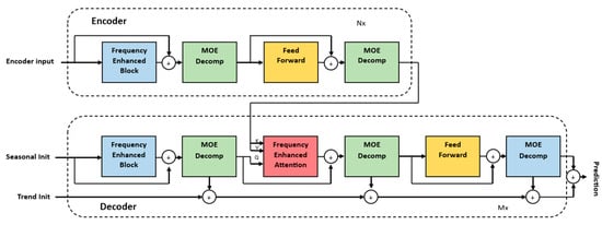 Like the Autoformer model, the FEDformer model uses seasonal-trend decomposition to identify global properties. The FEDformer model has a similar structure to the Autoformer model. However, it does not consist of three main blocks like the Autoformer model; instead, it consists of four main blocks: frequency-enhanced block (FEB), frequency-enhanced attention (FEA), feed-forward network and mixture of expert decomposition (MOEDecomp). The purpose of the FEB blocks is to discern crucial patterns within time series by integrating insights from the frequency domain. Within the domain of FEB, there exists a categorization into two variants: Fourier-enhanced block and wavelet-enhanced block. The FEDformer model uses high- and low-frequency components to represent the time series. Wavelet and Fourier transform are used in signal processing and analysis to represent signals in different domains. Applying Fourier transform to our time series yields the frequency resolution of the data, but it does not convey how these frequencies evolve over time. In contrast, wavelet transform can capture the frequency and the time information of the time series. It can capture both high- and low-frequency components at different points in time. In contrast to Fourier transform, the data do not have to be stationary. In the context of wind energy forecasting, weather parameters like wind speed and direction are dynamic and can rapidly change. Using Wavelet transform can help capture the varying frequency components of a possible non-stationary time series over time, providing more accurate information for forecasting models. FEDformer employs a strategy of randomly selecting a fixed number of frequencies. This approach serves to mitigate the challenges associated with linear storage and calculation costs, while also addressing the potential issue of overfitting. By utilizing a fixed number of frequency components, the model’s ability to generalize increases. As with FEB, FEM has two variants. In FEA with Fourier transform, the conventional queries, keys and values utilized in the canonical attention mechanism in the standard Transformer model undergo a modified attention process. This modification involves applying an attention mechanism in the frequency domain using Fourier transform. MOEDecomp is an advanced method designed to extract the trend component from a time series that exhibits a periodic pattern [17]. This approach utilizes a set of average filters with varying windows sizes, enabling it to capture different aspects of the underlying trends. By employing multiple filters, MOEDecomp can identify and isolate various trend components within the time series. This process is depicted in Figure 8 in the lower branch of the FEDformer decoder.