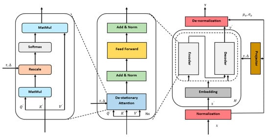 - Liu, Y.; Wu, H.; Wang, J.; Long, M. Non-stationary Transformers: Exploring the Stationarity in Time Series Forecasting. Adv. Neural Inf. Process. Syst. 2022, 35, 9881–9893. [Google Scholar]