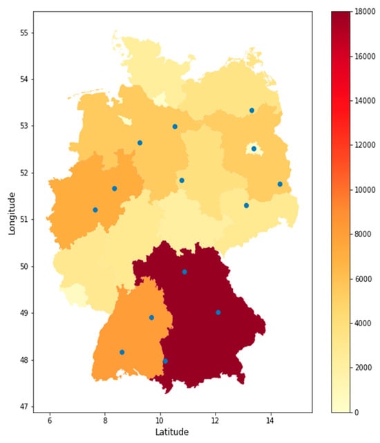 Selected weather stations and installed PV capacity by federal state in 2022. The blue dots represent the location of the selected weather stations.
