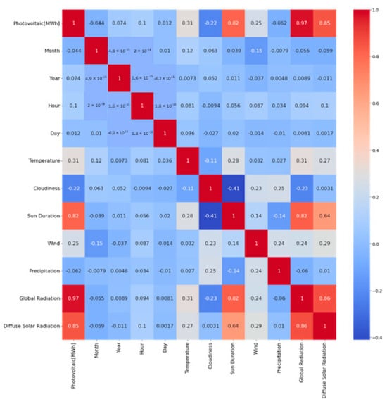Figure 12 shows a heatmap with the correlations between the respective parameters. The Pearson correlation coefficient was used for the calculation. The Pearson correlation coefficient is a measure of the linear relationship between two variables. It ranges from −1 to 1, where −1 indicates a perfect negative linear correlation, and 1 indicates a perfect positive correlation. As excepted weather parameters, such as diffuse solar radiation, global radiation and sun duration are very important for power generation. Cloudiness has a negative correlation of −0.22 with the power generated by photovoltaics. This implies that greater cloud cover reduces the power generation. Furthermore, wind has a correlation of 0.25 and temperature has a correlation of 0.31 with the power generated by photovoltaics. In addition, an analysis was carried out using the Spearman correlation coefficient. The Spearman rank correlation coefficient is a non-parametric measure of statistical dependence between two variables. Unlike the Pearson correlation coefficient, which measures linear relationships, the Spearman’s rank correlation rates the monotonic relationship between two variables, which means it detects whether there is a consistent trend in their association, even if it is not linear. The Spearman rank correlation coefficient, like the Pearson, emphasizes the strong positive correlation (>0.90) between sunshine duration, global radiation, diffuse solar radiation and energy generation from photovoltaics. It is crucial to remember that correlation does not necessarily imply causation.