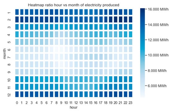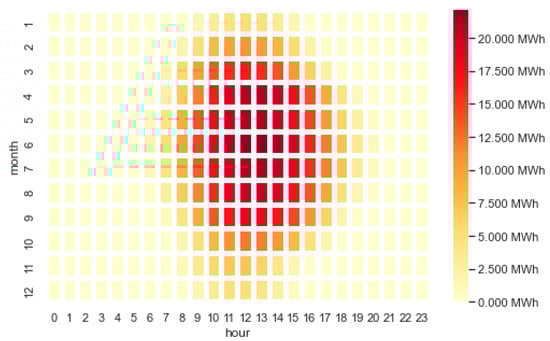 Figure 13 confirms the previous assumption. It shows the mean PV electricity generation for each respective month and hour. The mean value was computed by averaging the combination of all the data for each time window (month, hour) for the period from 2015 to 2021. During the midday hours in spring and summer, the photovoltaic systems produce the most energy. This is the case, for example, when there is a significant amount of direct global radiation and on days with many hours of sunshine. It shows seasonality over the year and daily periodicity.