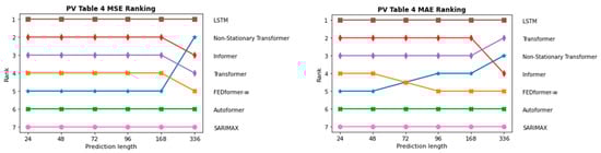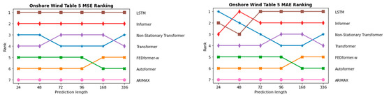 InFigure 19 and Figure 20, the sequence of the order of the individual models in terms of prediction length is depicted once for the two PV forecasting scenarios and in Figure 21 and Figure 22 for the two onshore wind scenarios. As expected, ARIMAX and SARIMAX perform the worst in almost all scenarios. This is because neural networks such as LSTM and Transformer are able to capture more complex patterns in the data as they can model more non-linear relationships. In the initial scenario with all parameters, which is shown in Figure 19, SARIMAX outperforms FEDformer, likely due to data inadequacies, particularly the time component. This is substantiated when examining scenarios for both onshore wind and PV forecasting, where FEDformer significantly improves compared to the initial scenario in terms of the MSE and MAE metrics. When considering the models Autoformer and FEDformer, they are fundamentally based on the idea of decomposing time series into various components or modes. However, as evident from the various rankings provided in Figure 19, Figure 20, Figure 21 and Figure 22, these models consistently lag behind other Transformer models that operate on a different concept. This is surprising, given that in the six benchmarks, these models actually outperform models like Informer or Transformer. Additionally, in the datasets concerning electricity and weather, which belong to the “same” domain as the one being discussed here, these models also exhibit strong performance. It is particularly surprising that FEDformer performs worse in PV energy forecasting, which exhibits a certain periodicity. However, it should be noted that the presented results in FEDformer and Autoformer studies pertain to univariate-to-univariate forecasting and multivariate-to-multivariate forecasting [16,17]. We are considering multivariate-to-univariate forecasting. The Non-Stationary Transformer model undergoes enhanced performance in predicting PV energy, especially with the increase in the forecast horizon compared to other models. It consistently ranks in the top 3 for the forecast horizon of 336, outperforming the base Transformer in terms of the MSE metric. However, it predominantly lags behind the Transformer model in the forecast horizon from 24 to 168 in both PV scenarios and in the forecast horizon from 72 to 168 in both onshore wind scenarios. In the subsequent analysis, the comparison between the Informer model and LSTM model is emphasized, as they predominantly outperform the other models in nearly all areas, especially the LSTM model.