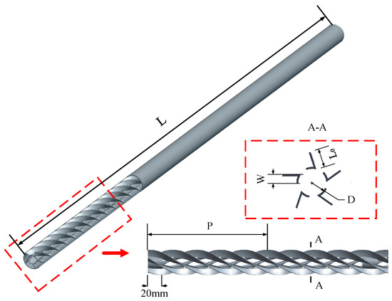 Figure 1 presents a schematic diagram of the L-shaped twisted tape insert structure applied in this study. Both the overall view and the cross-sectional view of the structure are displayed. As observed in the figure, P refers to the linear distance between two consecutive identical points on the tape, which plays a crucial role in influencing the heat transfer performance of the twisted tape. Additionally, the distance from the inner wall of the twisted tape to the center of the circular tube is denoted as D, impacting the size of the twisted tape and its volume proportion within the heat exchange tube, thus affecting heat transfer performance. Another dimension studied as an input parameter was the width of the L-shaped twisted tape, denoted as W. Variations in this dimension influenced the disturbance and vortex generation effects of the twisted tape on the fluid, making it a significant parameter for investigation.