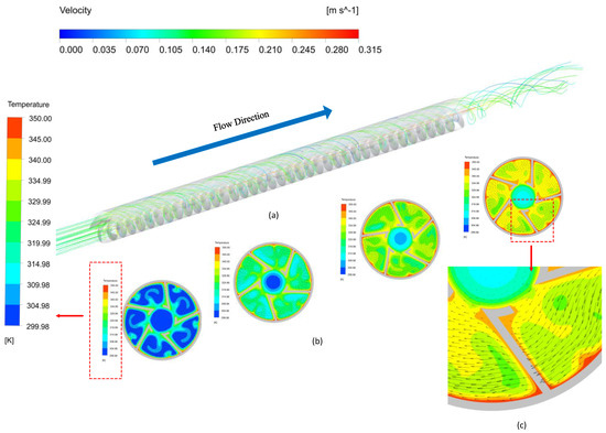 Velocity streamline distributions of working flow at Re = 3750. (a) temperature distributions of four selected representative cross-sections, (b) velocity streamline and temperature distributions of L region (c).