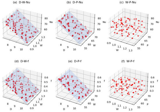 Firstly, this study conducted a visual analysis of the numerical simulation results (shown in Table 1) by presenting the relationships between the input parameters D, W, and P and the output parameters Nu and f in Figure 4. From (a) and (d) in the figure, it can be observed that the parameters D and W exhibit linear correlations with the output variables Nu and f. Similarly, (b) and (e) demonstrate that the relationships between D, P and Nu, f still exhibit an approximately linear relationship, although the linear relationship was weaker than that of the combination of D and W. On the other hand, the relationships between W, P and Nu, f appear more disordered. Since there may be linear correlations between input and output parameters, this was one of the reasons why multi-output linear regression was included in the algorithm selection in this study. As the scatter plots separate Nu and f, the mutual relationship between the two output parameters was also discarded. Therefore, multi-output regression methods were involved to simultaneously consider the interaction factors between the two output parameters.
