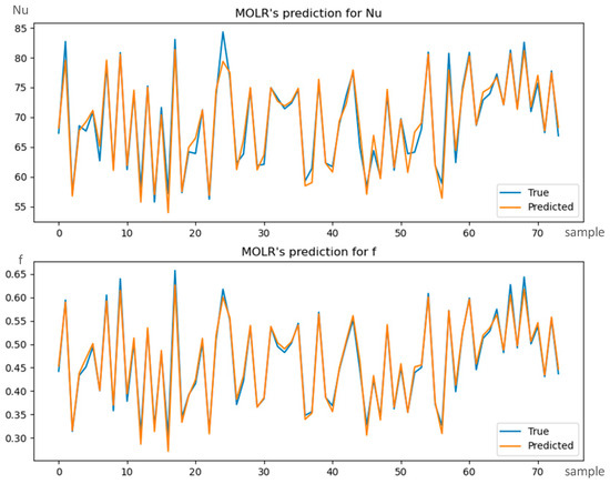 From the figures, it can be observed that MOLR had, overall, good fitting performance, as evidenced by the relatively low MSE and high R2. These metrics imply smaller errors and higher accuracy obtained from the regression results. Additionally, it is noticeable that the fitting performance of MOLR was higher for the f parameter compared to the Nu parameter. As expected, due to the simplicity of the computational theory of the MOLR method, it incurred a low training time.