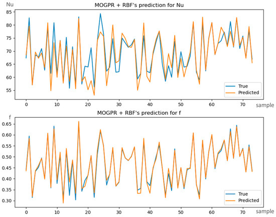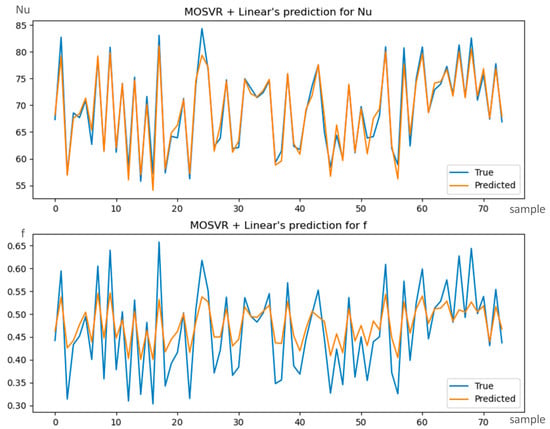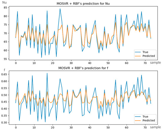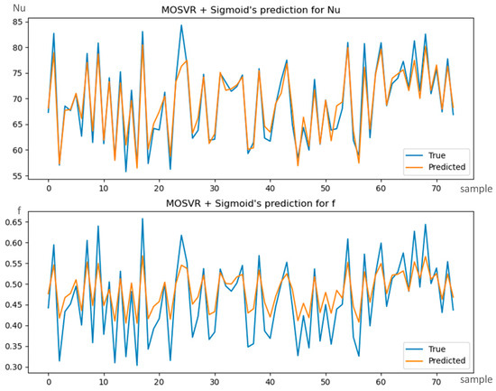 As mentioned in the previous section, the fitting performance of the MOSVR method was significantly influenced by the choice of the kernel function. Therefore, in this study, three different kernel functions, namely, the RBF kernel function, linear kernel function, and sigmoid kernel function, were applied to conduct a regression analysis of the MOSVR model. The validation results for the MOSVR method under these three kernel functions are presented in Figure 6, Figure 7 and Figure 8. The model’s performance metrics was showed in Table 3.