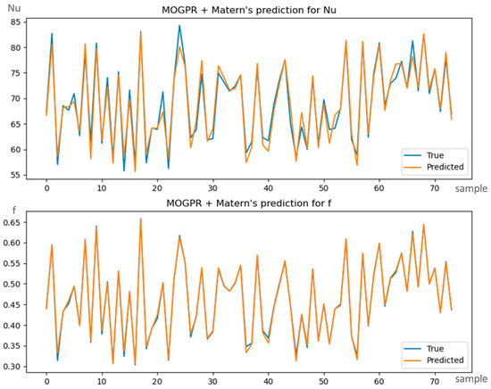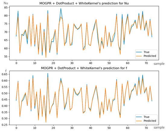 Similar to the MOSVR algorithm, the fitting results of the MOGPR algorithm are also significantly influenced by the kernel function. Consequently, this study applied three different kernel functions to the MOGPR algorithm for a more comprehensive analysis of its performance. These functions are MOGPR + Matern, MOGPR + RBF, and a combination of MOGPR + Dotproduct + WhiteKernel. The predictive outcomes under these three combinations, compared with the original data, are presented in Figure 9, Figure 10 and Figure 11, while the model evaluation metrics are displayed in Table 4.