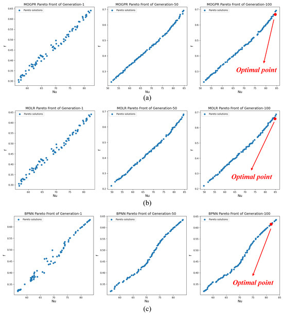 The final results for the three algorithms are recorded in Table 7. It is notable that all three methods exhibit a trend of selecting larger Nu values, despite this leading to higher f values. This indicates that when considering the comprehensive evaluation of the heat transfer coefficient and flow resistance using PEC, a higher weight can be attributed to the heat transfer coefficient. Furthermore, the geometric dimensions of the L-shaped twisted tape inserts corresponding to the three optimal points were remarkably similar, suggesting that this set of dimensions yields the optimal overall heat transfer performance.