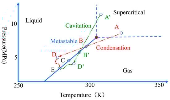 The Brayton cycle of supercritical carbon dioxide (S-CO2) is an attractive power generation technology that offers potential advantages in terms of cycle efficiency [1,2]. As a working fluid, CO2 has good stability and abundant storage. In a supercritical state, CO2 has large specific heat capacity, large compressibility, large density, low viscosity and other qualities that can significantly reduce the compression work and then improve the cycle efficiency [3]. The closer the inlet condition is to the critical point, the greater the system performance is [4,5,6]. However, when the compressor inlet condition approaches the critical point, the thermophysical properties of CO2 will change dramatically, deviate significantly from the ideal gas and show a strong real-gas effect [7,8]. On the other hand, the critical point is the end of the saturation line. When the inlet condition of a compressor approaches the critical point, cavitation and condensation may be triggered in the impeller blade channel due to the local flow acceleration [9]. In Figure 1, the processes of phase change are illustrated on a pressure–temperature diagram. The working fluid expands isentropically from the supercritical region (point A) to the gas region and then reaches the saturation line (point B). The phase change manifests as condensation, where the droplets are generated in a gas environment. Condensation does not occur immediately when the saturation line is reached but continues to expand isentropically in the form of gas. The working fluid enters a metastable state until it arrives at the Wilson line (point D), where the spontaneous nucleation process will be triggered [10,11]. Finally, the fluid will return to equilibrium (point E). If condensation is equilibrium, the fluid will condense along the saturation line (from point B to point C). Cavitation process starts in supercritical conditions (A’), which are closer to the liquid phase. The fluid also expands isentropically, passes through the liquid region and reaches the saturation line (point B’). The fluid has low compressibility, which results in a small temperature drop and a large pressure drop. The fluid continues to expand to point D’ and then cavitation occurs. The phase change usually occurs on the suction side. Condensation and cavitation do not occur at the same time. Condensation occurs in the gas environment, and cavitation occurs in the liquid environment. Condensation droplets on the impeller blade may further deteriorate the performance of the compressor or cause erosion [11,12,13,14]. Cavitation can generate large amounts of bubbles, and bubbles occupy most of the channel, resulting in blockage [15,16,17]. Also, it is possible for the temperature and pressure of S-CO2 fluid to decrease below the critical point and pass through the saturation line, causing the phase change under the compressor’s start–stop and off-design settings. Few experiments have been conducted on the flow and phase change of S-CO2 compressors. The studies of Sandia National Laboratories have shown that an S-CO2 compressor can work stably no matter what phase the inlet condition is in [18,19,20]. Noall [21] believed that a compressor could achieve a long-term stable operation with a two-phase inlet condition, which is limited to a low rotational speed. The preceding investigations are concerned with the overall performance of a compressor and do not provide a clear picture of the specific internal flow characteristic of an S-CO2 compressor. It is still difficult to measure the internal flow through experiments due to the small size of the impeller. Although some studies state that the phase change has little effect on a compressor’s performance, most studies consider a potential two-phase operation as a high risk and do not recommend it for a high-reliability system [22]. Therefore, it is necessary to investigate the quantitative effect of the near-critical nonequilibrium phase change on the performance of a S-CO2 centrifugal compressor and provide theoretical guidance for the design and operation strategy for S-CO2 compressors.