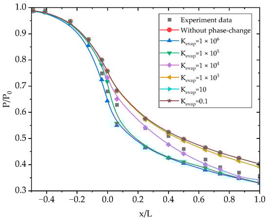 The nozzle with different Lee model coefficient values was simulated under an inlet condition with a relative entropy of 1.18. The pressure profile in the nozzle for various Lee model coefficient values is illustrated in Figure 4. In Figure 4, P0 is the inlet pressure, L is the length of the nozzle, and P is the pressure at the centerline. When the Lee model coefficient is 10 or 0.1, the effect on the flow field is almost insignificant, and the pressure profile is the same as the profile without phase change. If the coefficient is 1 × 106, the effect on the flow field is too strong. The pressure deviates from the experimental data, and the flow will approach equilibrium soon. When the working fluid passes through the saturation line, condensation occurs immediately, behaving as equilibrium condensation. Finally, the coefficient of 1 × 104 is adopted in this paper. The pressure profile with this coefficient matches the experiment data very well, which manifests as nonequilibrium condensation. Nonequilibrium condensation is a delayed condensing phenomenon affected by flow velocity. The fluid will not condense on the saturation line due to the short timescale of condensation to expansion until it reaches the Wilson line with a certain value of subcooling.