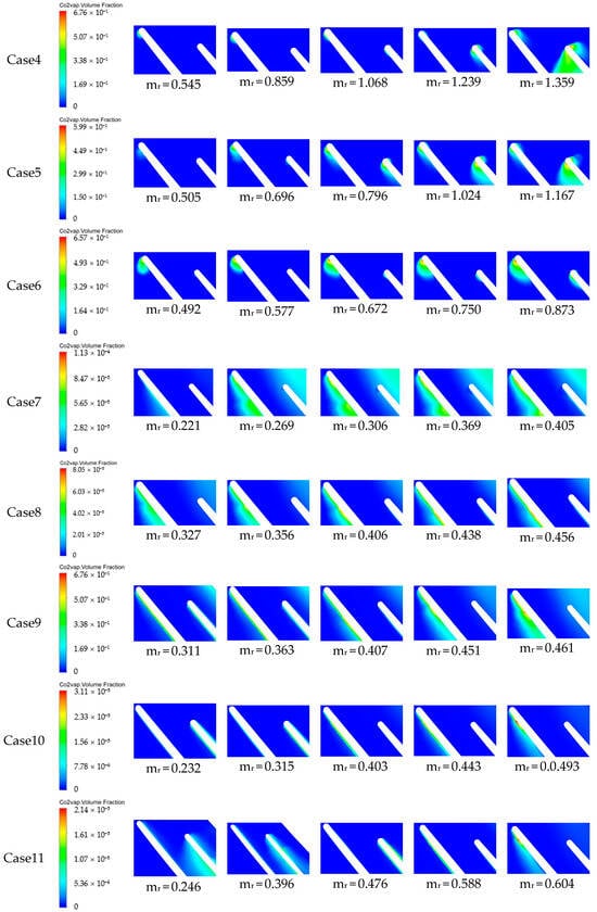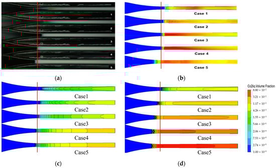 As the high-pressure CO2 fluid expands and accelerates in the throat, the fluid speeds up into supersonic flow with a decrease in temperature and pressure. When the fluid enters the liquid region, condensation occurs. The comparison of the condensation onset between the experiment results and numerical simulations is shown in Figure 5. Figure 5a shows the results of the Lettieri experiment. The white region is the condensation place of CO2, the black region is the non-condensation region, and the red line indicates the throat. Figure 5b shows the contour of the predicted liquid CO2 volume fraction by Brinckman [25]. When the relaxation time coefficient in the Lee model approaches infinity, the fluid-phase transition rate also approaches infinity. Condensation will occur as long as the fluid passes through the saturation line, which can be regarded as an equilibrium phase-change model. Figure 5c is the contour of the liquid CO2 volume fraction with a smaller relaxation time coefficient, which is the outcome of a nonequilibrium condensation simulation. Figure 5d is the contour of the liquid CO2 volume fraction with a bigger relaxation time coefficient, which is the result of an equilibrium condensation simulation. The numerical simulation can better predict the trend of condensation onset under various inlet pressures. In addition, due to the high precision of the real-gas property table and the nonequilibrium condensation model, the prediction results in this paper are more accurate than those of Brinckman. The RGP table contains subcritical and supercritical thermophysical properties and fully considers the thermophysical properties of the two-phase region. The supercritical thermophysical properties can be read directly from the table and have sufficient resolution near the critical point. For the properties of the metastable region, the thermophysical properties will be interpolated. Secondly, the simulation considers the nonequilibrium condensation model. When the fluid passes through the saturation line, condensation will not occur immediately, but it will take a certain amount of relaxation time. As the picture indicates, the condensation onset will move to the inlet with the increase in inlet-relative entropy. The throat has a small area, and the density will change drastically. The difficulty of convergences will also increase, and the prediction of case 5 deviates slightly more from the experimental data. Comparing Figure 5c and Figure 5d, the condensation onset of the equilibrium condensation model is closer to the inlet, and the volume fraction of liquid CO2 is larger.
