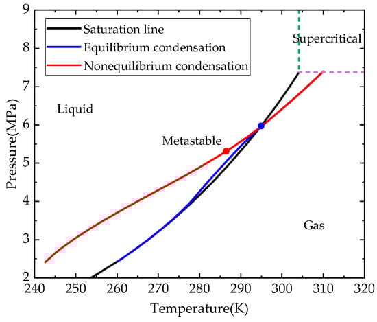 The comparison of pressure and temperature profiles between the nonequilibrium condensation model and the equilibrium condensation model in case 3 is shown in Figure 6. The temperature and pressure are 294.97 K and 5.96 MPa, respectively, which are measured at the condensation onset of the equilibrium condensation model. The saturation pressure at 294.97 K is 5.97 MPa, which is slightly higher. Considering how the RGP table works, the temperature and pressure are estimated by interpolation, and there will be some errors. Therefore, this point can be regarded as saturated. However, the temperature and pressure are 286.47 K and 5.31 MPa, respectively, in the nonequilibrium condensation model. The pressure is much lower than the saturation pressure of 286.74 K, which means this point is far from the saturation line. As a result, the CO2 fluid will not condense immediately after passing through the saturation line but will continue to expand isentropically as a gas below the critical point before condensation occurs.
