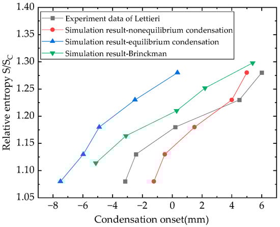 A quantitative comparison of condensation onset is described in Figure 7. The relative entropy is the ratio of the inlet entropy to the critical entropy. The numerical calculation prediction findings are closer to the throat than the experimental data, and the curve distribution variations follow a similar pattern. The flow field of the nozzle becomes unstable when modeling nonequilibrium phase-change condensation. However, the condensation onset is dictated by thermodynamic conditions, so it can be considered practically unchanged.