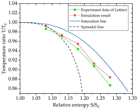 The Wilson line is plotted using the data from Figure 7. Figure 8 shows the comparison between the Wilson line calculated by Fluent and the experimental test data. T is the temperature at condensation onset, and Tc is the critical temperature. The Wilson line can be regarded as a kind of material property of condensing vapor substance [11], which is affected by the expansion rate. Bigger expansion rates cause the Wilson line to shift towards greater subcooling. The Wilson line is used to assess the subcooling of nonequilibrium condensation. These two lines exhibit a similar trend, and the simulation prediction is closer to the throat. As the inlet entropy approaches the critical point, the difference between them decreases because condensation occurs faster at this point. The nonequilibrium condensation phenomenon is more drastic with increasing inlet entropy, and the condensation shows noticeable hysteresis. The degree of subcooling before condensation is underestimated by the Fluent numerical simulation. In comparison to the Lettieri experimental results, the nonequilibrium phase-change model and the associated two-phase-flow simulation method employed above are reliable and can be applied to the subsequent compressor research.