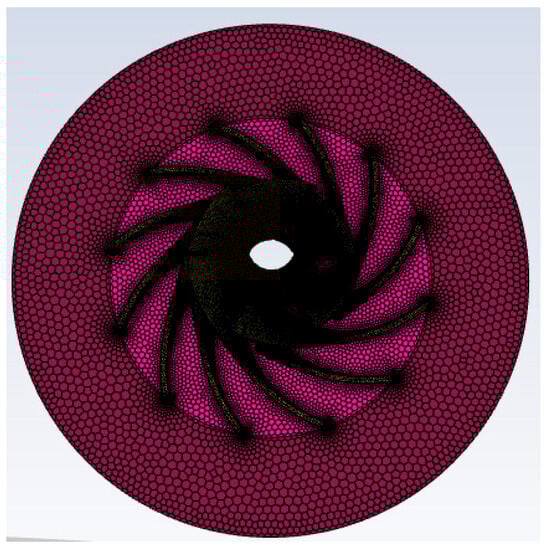 Due to the difficulty of modeling the S-CO2 centrifugal compressor, the drastic change in thermophysical properties and various inlet conditions make it difficult to simulate and compare all the experimental data. Additionally, the experimental data at a speed of 50 krpm is more comprehensive than the publicly available data. Therefore, the simulation shaft speed was set to 50 krpm. The same numerical solver was adopted. Two turbulence equations of the SST model were applied, and a coupled algorithm was utilized for the coupling of the pressure-velocity field. The inlet boundary condition was set at 305.3 K and 7.687 MPa. The outlet was set as a mass flow outlet. Since there are no significant strong temperature gradients in the flow field, the assumption of adiabatic walls was used. No-slip boundary conditions were taken into account on the walls, and a constant rotation speed was applied to the hub and impeller.