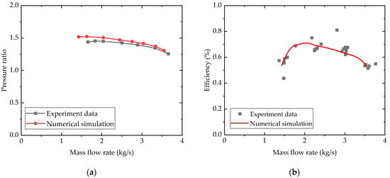 Comparisons of performance curve simulated to experiment data: (a) pressure ratio and (b) efficiency.
