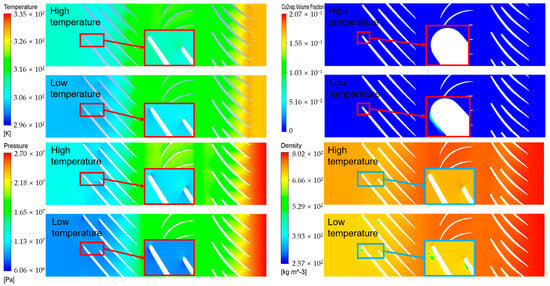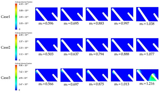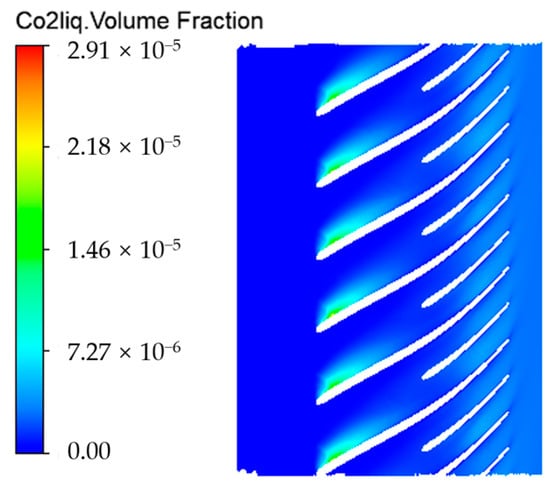 The contour of the liquid CO2 volume fraction at 0.5 span is presented in Figure 11. The mass flow rate is 2.543 kg/s. The low-pressure and low-temperature regions are found at the leading-edge suction sides of blades. The regions result from the flow acceleration around the suction side of the blade’s leading edge, which is caused by the geometrical curvature. Due to the short passage before the impeller inlet, only a small amount of energy can be added to the fluid converted from the mechanical energy of the blades, which is insufficient to compensate for the internal energy decline caused by flow acceleration. If the speed of the CO2 working fluid is very high, the impeller does not have enough time to work on the fluid. The S-CO2 may slip into a two-phase region, where condensation might take place in those regions. The condensation place is marked out in Figure 10, and the maximum CO2 liquid volume fraction is 2.91 × 10−5. As the working fluid continues to flow through the passage, the impeller interacts with the fluid, leading to an increase in temperature and pressure beyond the critical point, resulting in the disappearance of condensation.