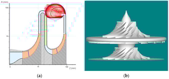 Design diagram of centrifugal impeller: (a) 2D and (b) 3D.