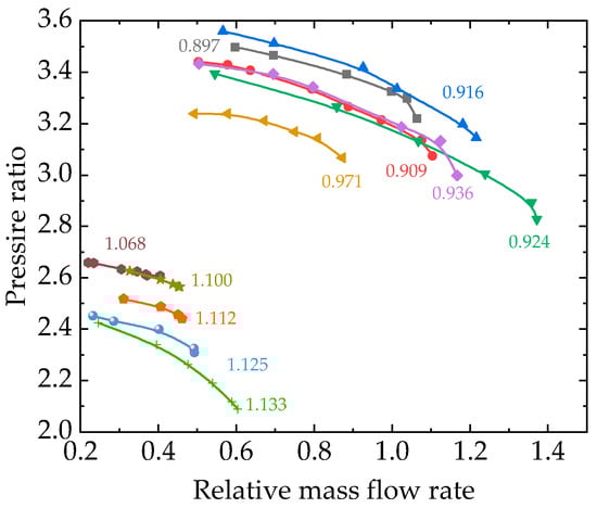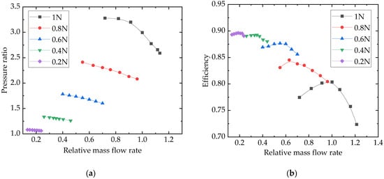 The overall aerodynamic performance of the compressor at its design point is assessed in Figure 13 in terms of the pressure ratio and efficiency. The relative mass flow rate is the ratio of the compressor mass flow rate to the design mass flow rate. The design speed N is 25 krpm, and the performance of the compressor at five speeds was calculated. In the simulations, the back pressure was adjusted to alter the compressor mass flow rate. At low rotation speeds and mass flow rates, the pressure ratio is relatively small, and the stable operation range will be narrower. The pressure ratio from the simulations demonstrates a nearly linear dependence on the mass flow rate. As the rotation speed increases, the pressure ratio also increases. However, stability issues in the simulations arise when dealing with a large mass flow rate, resulting in a rapid decline in efficiency. The primary inefficiency in the numerical simulation presented in this paper stems from the omission of the volute’s influence on the compressor.