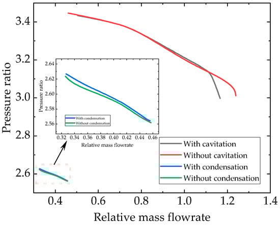As we all know, the intake of a compressor features nearly isentropic suction phenomena. If the relative entropy is smaller than one, the S-CO2 fluid behaves like a liquid. The working fluid will first pass through the liquid region and then penetrate within the two-phase region; moreover, the phase change occurs as cavitation. The compressor has a large pressure ratio and a small temperature rise, reflecting the characteristics of a pump. The small temperature rise is consistent with the fact that compressibility in liquid states is low. If the relative entropy is greater than the critical point, the working fluid will pass through the gas region rather than the liquid region and then arrive at the two-phase region. The S-CO2 fluid behaves like a gas. In this situation, the phase change occurs as condensation. The temperature rise is large due to the compressibility of the fluid—the low density of the fluid results in a significantly low dimensional pressure rise in the compressor. In case 5 and case 9 inlet conditions, Figure 15 compares the performance curves of the compressor with and without phase changes. Cavitation has little effect on the pressure ratio of the compressor, but it does affect the compressor’s choke mass flow rate. Cavitation reduces the choke mass flow rate of the compressor, but condensation makes the compressor pressure ratio increase slightly.