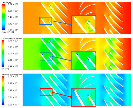 Performance curves for the various relative entropy inlet conditions are illustrated in Figure 16. If the inlet-relative entropy is smaller than one, the surge mass flow rate remains nearly the same, but the choking-limit mass flow rate decreases as the relative entropy increases due to the drop in the speed of sound. The simulation indicates that at high mass flow rates, the flow may transition into transonic flow, as shown in Figure 17. Figure 17 depicts the contours of the compressor for large mass flow rates, which include density, local sound of speed and relative Mach numbers. A sharp decline in pressure takes place, leading to a sudden drop in density and the speed of sound, and then the relative Mach number will rise, which may cause the blockage to come into being earlier. If the relative entropy is greater than one, the stable operation mass flow rate becomes smaller since the density decreases with the relative entropy.