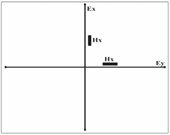 Two pairs of horizontal electrodes and two magnetic sensors are set orthogonally; the azimuth variation is less than 1°; and the top of the horizontal magnetic coil is 8–10 m from the center. Two sets of electrodes and horizontal magnetic coils face true north (X) and true east (Y) (Figure 2).