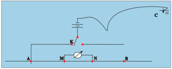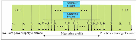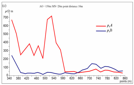 AO = BO = 70 m–150 m, MN = 20 m, point distance = 10 m. In the field, electric leakage inspections were performed before, during, and after work to ensure that the wires did not leak electricity. Between 5 and 10 points were assigned a point number, and suspicious, mutational, and abnormal points were repeatedly observed.