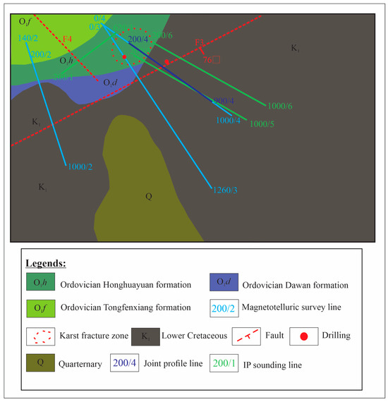 The cross-section, inference, and interpretation results of 2D line 1 are shown in Figure 5. At 260 and 500 m along the survey line, Ordovician limestone from the Fenxiang Formation in the Lower Ordovician System is exposed. Between 40 and 220 m down, the resistivity value is relatively high (200–1500 ohm), suggesting that this is also Ordovician limestone from the Fenxiang Formation in the Lower Ordovician System. The total cross-section has a low resistivity (less than 400 ohms) between a depth of 600 and 800 m, which is interpreted to represent Cambrian dolomite. The outcome of this inferential analysis is shown in Figure 6. A structural fracture zone, identified as the F4 fault, is thought to be reflected in the resistivity contour for about 300 m, where there is a considerable gradient shift in the lateral direction. The F4 fault has a dip angle of roughly 81°, and there is a notable change in resistivity close to the fault zone compared to the surrounding region. The rocks close to the fault zone seem to be more fractured, suggesting better conditions for water containment. The downward extension of the fault is inferred from the longitudinal variation trend of the contour lines close to the fault zone, which is more than 800 m.