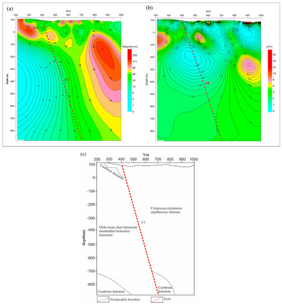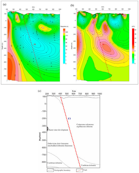 The outcomes in Figure 8 show the 2D inversion diagram for the line 6 polarizability, resistivity, and geological interpretation section. At 130 m from the survey line, the exposed Cretaceous strata show relatively low resistivity with notable lateral variation. The survey line exhibits significant resistivity in the 200–400 m range (50–300 ohm.m), which is assumed to represent Ordovician chert limestone interbedded with dolomitic limestone. The Cretaceous calcareous and argillaceous siltstone is predicted to have low resistivity (less than 40 ohm.m.) and a significant formation dip in the 400–1000 m range. Notably, as demonstrated in Figure 8b, the polarizability is particularly high close to the fault zone, indicating strong water-bearing characteristics. At 440 m, the resistivity contour exhibits a considerable gradient shift in the lateral direction, pointing to a structural fracture zone known as the F3 fault. According to the contour line morphology, the fault has a dip angle of around 76° and an apparent resistivity differential close to the fault zone. This suggests that the rocks close to the fault are comparatively broken up and that the conditions for water-bearing are better here. The fault seems to continue for more than 900 m, according to analysis of the contour lines’ longitudinal variation trend.