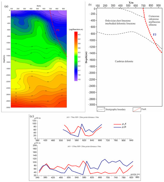 At a depth of 750 m, the resistivity contour exhibits a significant lateral gradient change, and the low resistivity characteristic extends to great depths. This is supposed to be indicative of the structural fracture zone, which is identified as the F3 fault. Based on the morphological features of the contour line of the section, it can be deduced that the F3 fault exhibits a relatively steep inclination, with an estimated dip angle of approximately 76°. The variation in resistivity is conspicuous in the vicinity of the fault zone, leading to the inference that the rock in the vicinity of the fault zone is comparatively fractured and the hydrogeological conditions are more conducive to water storage. Based on the longitudinal variation pattern of the contour lines in proximity to the fault zone, it can be deduced that the fault has a downward extension of at least 1200 m.
