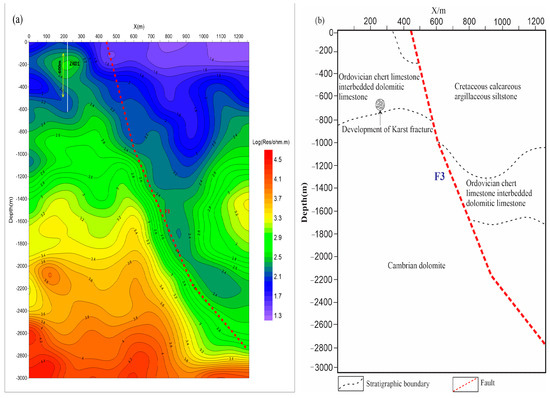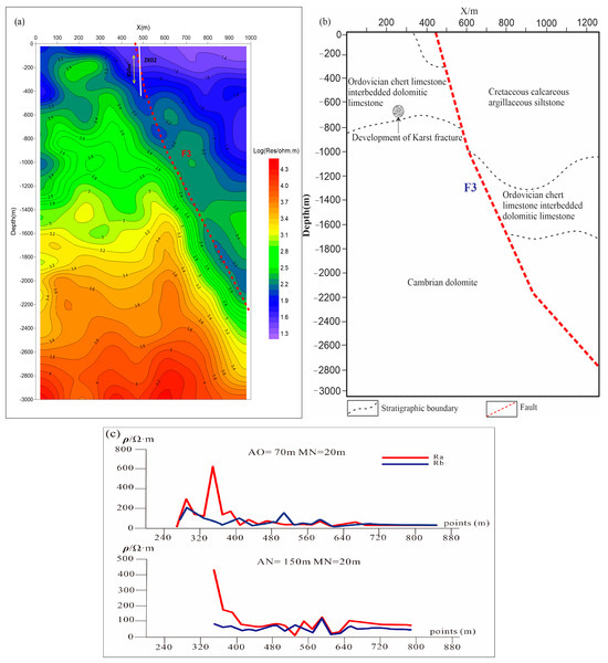 The resistivity contour exhibits a significant gradient alteration in the horizontal direction at a distance of 400 m, which is believed to be indicative of the structural fracture zone known as the F3 fault. The dip angle of the fault is estimated to be approximately 76° based on the morphological characteristics of the contour line of the section. A notable resistivity difference is observed in the vicinity of the fault zone. The rocks in proximity to the fault zone exhibit a higher degree of fragmentation, and the hydrogeological conditions are comparatively more favorable to water retention.
