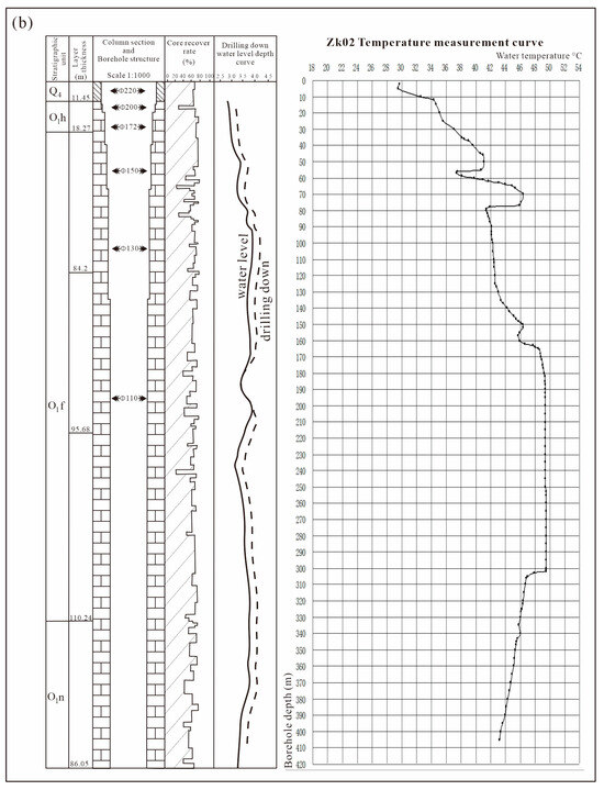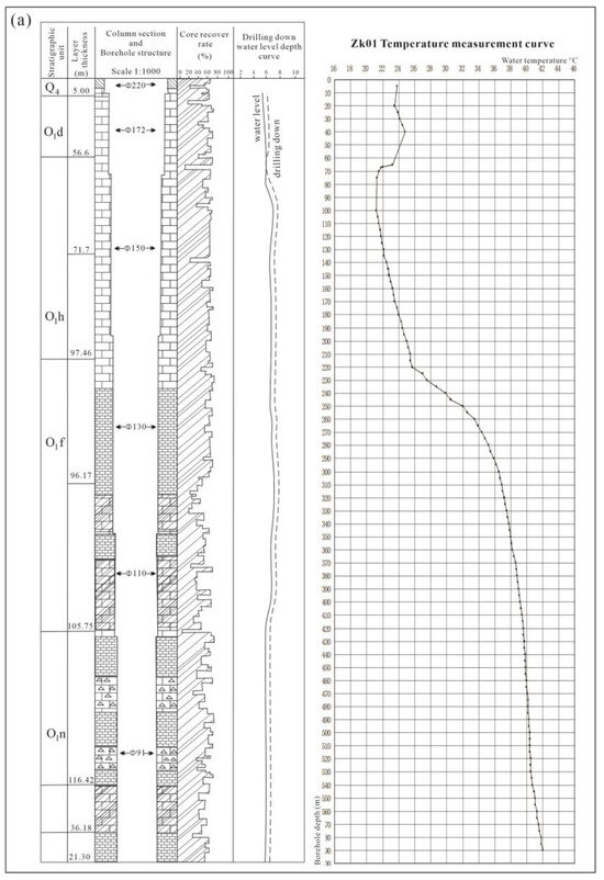 ZK01 and ZK02 boreholes lithological columns and temperature curves (a,b), respectively.