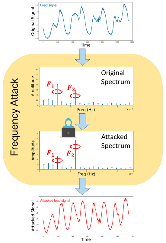 In this paper, we introduce Frequency Spectrum Attack (FSA), a novel technique performed in the frequency domain. Our approach revolves around investigating the time-dependent behavior of data in the frequency domain through spectral analysis using the Fast Fourier Transform (FFT) technique. By identifying and extracting dominant frequencies with the highest significance, we strategically manipulate their amplitudes to induce substantial, yet undetectable, changes in the original signal’s profile, yet leading to significant signal degradation. Notably, we purposely avoided the manipulation of frequencies, as they are susceptible to detection through spectral analysis tests by grid operators. Our focus on amplitude manipulation ensures that the crafted attack remains stealthy and evades detection, augmenting its potency in compromising the targeted system. Figure 1 elucidates the simple principles of the proposed FSA on a time-series signal.