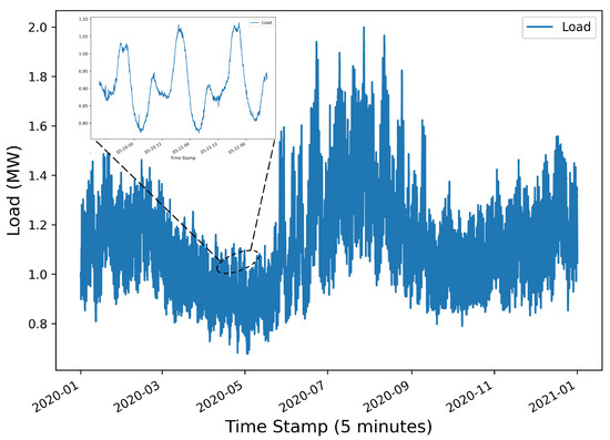 The load dataset for training, testing, and validation was taken from The New York Independent System Operator [24], from 1 January 2020 to 1 January 2021. A time interval of five minutes was utilized for recording the load data points. The dataset load demand for a year is shown in Figure 2. The dataset is partitioned into three subsets: training, testing, and validation sets. The training set comprises data from 1 January 2020 to 5 October 2020, totaling 80,000 data points. For the validation and test subsets, data from 6 October 2020 to 14 December 2020 (20,000 data points) and 15 December 2020 to 26 December 2020 (1500 data points) are respectively defined.