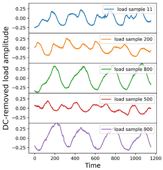 Readers are encouraged to refer to [23] for more information about the model’s architecture and optimal hyperparameters. The input to the LSTM model consists of a four-day load profile, comprising 1152 data points, while the output is a five-hour load prediction in the future, encompassing 60 data points. Figure 4 displays a selection of random DC-removed load profiles extracted from the original load dataset.