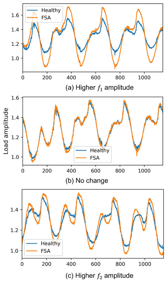 Some examples of the FSA impact on the LSTM input are shown in Figure 6. As Figure 6 illustrates, some features are noticeable from the proposed attack. Due to the specific optimized achieved in this work, the fabricated data can be categorized into three different types. The categories can be different depending on ranges: (a) higher amplitude of for the FSA signal compared to the healthy signal and similar amplitudes, , (Figure 6a); (b) the approximately equal amplitudes of and in the FSA and healthy signals, , (Figure 6b); (c) 3-higher amplitude of for the FSA signal compared to the healthy signal and the similar amplitudes, , (Figure 6c). Identifying this attack poses a formidable challenge due to its intrinsic nondeterministic nature, setting it apart from other FDIA types like scaling and ramping attacks.