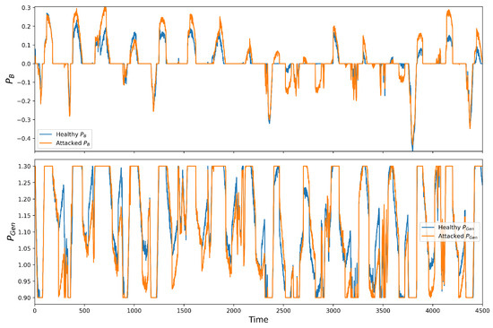 Figure 9 illustrates the impact of FSA on the EMS outputs. We observe harder fluctuations in under FSA than a no-attack normal condition. More importantly, the average battery utilization (, where N is the LSTM input length) has increased almost 45% under FSA compared to the healthy condition. As the goal of the EMS system was to minimize the battery’s usage, the increment in battery utilization caused by FSA deteriorates the EMS performance.