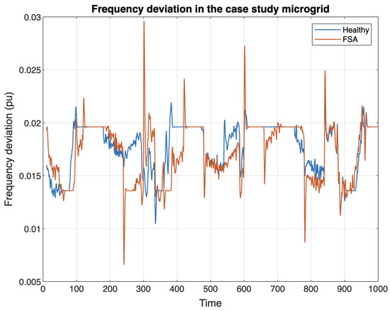 Figure 10 depicts the frequency deviation in the case study model microgrid for a healthy system and a system under FSA attack. It is shown that the attack has been managed such that the generator does not go to the overload mode. Also, the load deviation is smooth and there is no sudden deviation in demand, so the frequency relays wont take any action. The generator control is set to maintain the frequency deviation of less than five percent for normal load deviation. It is shown that frequency deviation under FSA attack still remains less than the standard threshold which is undetectable for frequency sensors.
