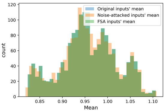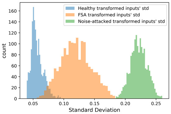 STD distribution of the healthy, FSA, and noise-attack inputs.